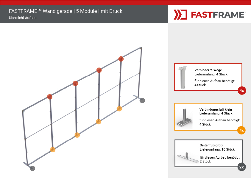 Der FASTFRAME™ gerade Wand mit 5 Modulen ist die ideale Lösung für professionelle Präsentationen, Messen und Events. Dank seines leichten, vormontierten Aluminiumrahmens mit 40 mm Profil lässt er sich in Sekundenschnelle aufstellen – ganz ohne Werkzeug. Eine zentrale Stützstange sorgt für zusätzliche Stabilität, während optionale Standfüße den Halt optimieren.